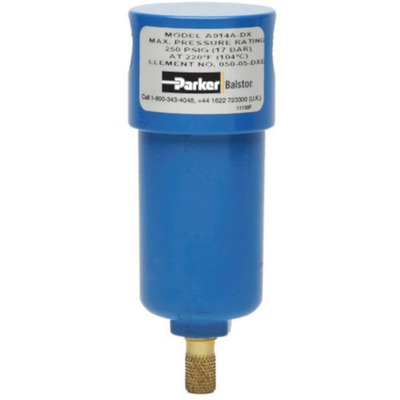 Models A914D, A914P, A914, A914A Models A914P and A914D are 1/4” line size assemblies with simple, reliable “automatic” drains used for low flow applications with moderate levels of liquid contaminate. The A914P is designed to empty condensate when there is a sudden pressure drop through the system (intermittent compressed air demand applications). The A914D incorporates an overnight drain which will drain liquid contaminate when the compressed air system pressure drops below 5 psig (0.4 barg). The standard A914 utilizes a standard manual threaded drain. All models have a transparent polycarbonate bowl with an aluminum head. The Model A914A has a zinc bowl. |  |