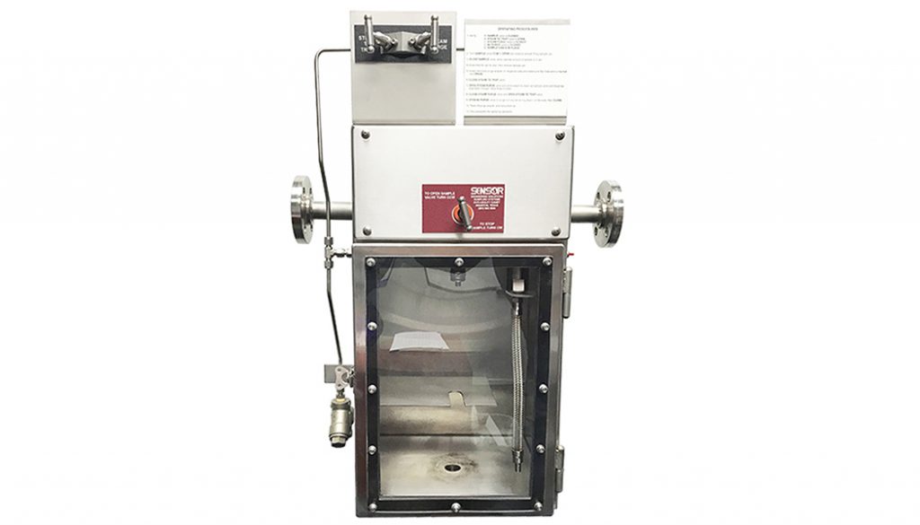 Heavy Products Sampling SystemsThe SENSOR Heavy Products Sample System (HPSS) is designed to collect samples of hot, heavy products (such as resid, asphalt, hot tar, gas oil, resins, slurries, surfactants, and emulsions) while maintaining personnel safety. Sample Heavy Products with Minimal DowntimeThe HPSS comes with 3 standard features unique to SENSOR which include a removable cartridge valve, condensate-free steam flush assembly, and twist lock purge adapter. Removable Cartridge Valve. This allows for separating the valve’s critical components from the sample line without removing the valve body and pipe spool from the process line in the event of required maintenance. The cartridge can simply be removed from the sample valve base and repaired or replaced with a new one, greatly reducing downtime. Condensate-Free Steam Flush Assembly. This assembly utilizes a unique 3-way valve and steam trap to ensure that condensate-free steam is consistently available for purge operations. The steam purge clears any potential blockage from the sample path without disrupting the process flowing in the sample line. Twist Lock Purge Adapter. Without the need for tools, an operator can easily install the twist lock purge adapter onto the dispensing tube and utilize steam to completely flush out the sample pathway to the drain of the enclosure. The steam flush is directed in a controlled manner without creating a mess on the inside of the enclosure or window from splatter. | ![]() |